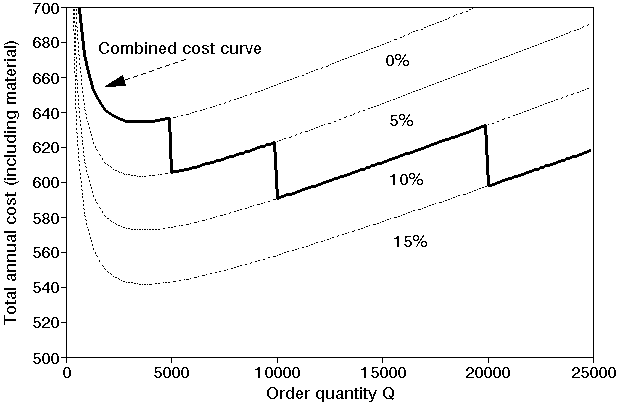 The effect of these quantity discounts (breaks in the cost structure) is to create a discontinuous total annual cost curve as shown below with the total annual cost curve for the combined discount structure being composed of parts of the total annual cost curves for each of the discount costs.