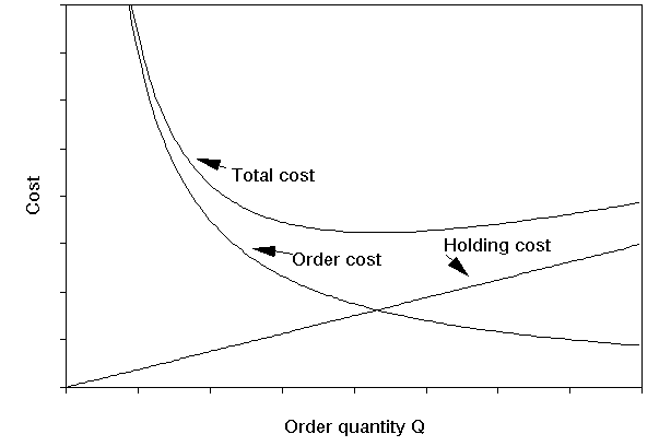 The diagram below illustrates how these two components (annual holding cost and annual order cost) change as Q, the quantity ordered, changes. As Q increases holding cost increases but order cost decreases. Hence the total annual cost curve is as shown below - somewhere on that curve lies a value of Q that corresponds to the minimum total cost.