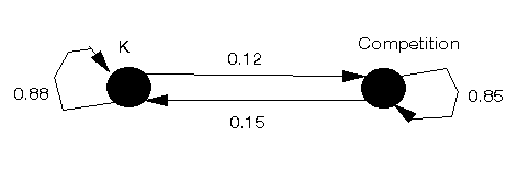 Observe that, each year, a customer can either be buying K's cereal or the competition's. Hence we can construct a diagram as shown below where the two circles represent the two states a customer can be in and the arcs represent the probability that a customer makes a transition each year between states. Note the circular arcs indicating a "transition" from one state to the same state. This diagram is known as the state-transition diagram (and note that all the arcs in that diagram are directed arcs).