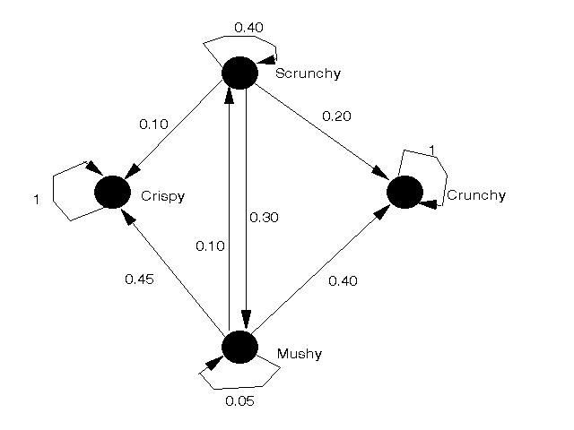 Note here that the states corresponding to Crispy and Crunchy are absorbing states (states which, once reached, cannot be left). States which are non-absorbing are often called transient states.