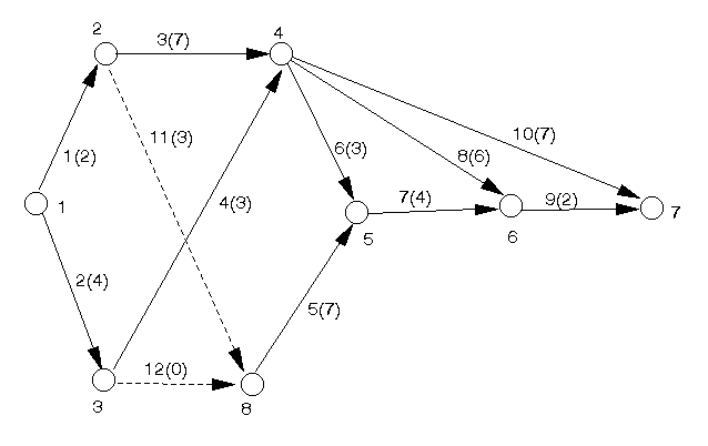 Suppose that we had included in our list of precedence relationships "activity 3 must be finished before activity 8 can start" - then the easiest way to represent this on the network diagram is by having a dummy activity, with a zero completion time, directed from node 3 (the end of activity 3) to node 7 (the start of activity 8).