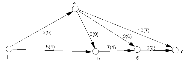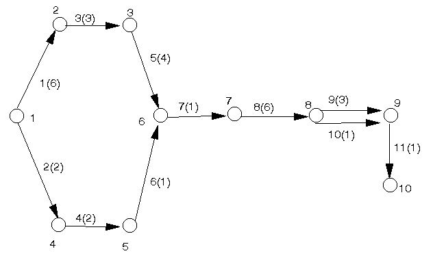 In the network diagram shown below which represents this project, each arc represents an activity and is labelled with the activity number and the associated completion time (shown in brackets after the activity number). This network is an activity on arc (AOA) network. The nodes of the network represent the start (and end) of activities and are regarded as events.