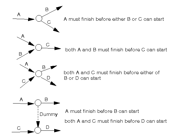 In the last situation shown above we have a dotted arc. This dotted arc is a dummy activity. Dummy activities often have a zero completion time and are used to represent precedence relationships that cannot be easily (if at all) represented using the actual activities involved in the project. By convention dummies are always shown as dotted arcs in network diagrams.