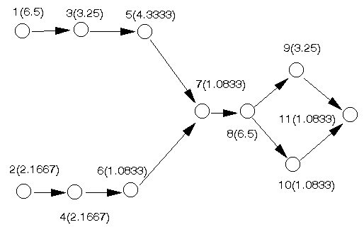 Then by elementary statistical theory these sub-activities together have an expected time of 3 + 3.5 = 6.5 (the original expected time for activity 1) and a standard deviation equal to [(0.3333)2 + (1.1667)2]0.5 = 1.2134, lower then the previous standard deviation of 1.5. A lower standard deviation implies more certainty so, by splitting activity 1, we are actually more certain about how long it will take. This reduction in uncertainty is plainly of benefit.