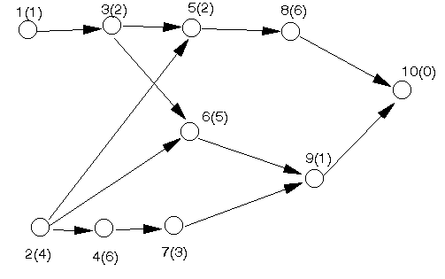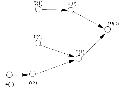 The network diagram is shown below. Note the use of a dummy activity (activity 10, with a completion time of zero) to represent the end of the project. Any nodes (activities) which, in the original network, have no precedence relationships coming out from them must be connected to this dummy activity to ensure that we correctly account for the end of the project. For this problem this means that activities 8 and 9 must be connected to activity 10.