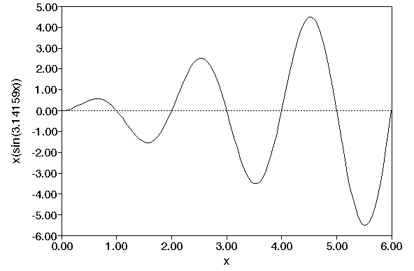 In other words the package has decided the solution is x=3.5287 with the associated objective function value being -3.5144. The only problem is that this is incorrect! To see this suppose that we plot on a graph the objective function x(sin(3.14159x)) for values of x from 0 to 6. We get the graph shown below.