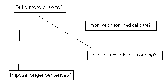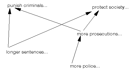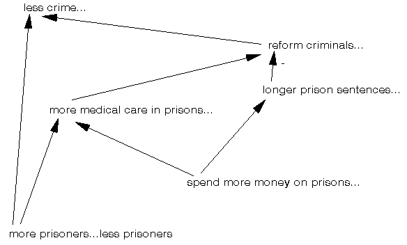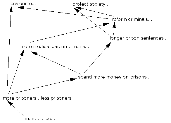 As an example we show below a small map based on our crime example given above. You can see that the goals (at the top of the map) are "less crime" and "reform criminals" and we have a number of options available, e.g. "more medical care in prisons"